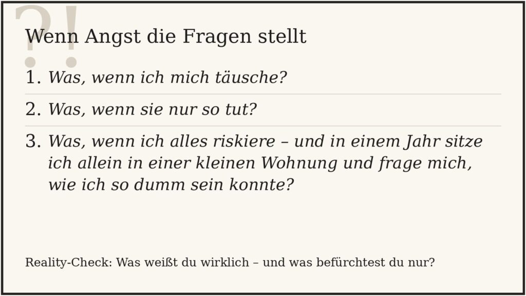 Auch diese Fragen sind nicht besonders romantisch, ich weiß. Aber sie helfen, im eigenen Inneren wieder etwas Ordnung zu schaffen. Sie holen euch aus dem Gefühlskino zurück in die Wirklichkeit, ohne gleich alles zu zerstören.